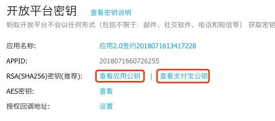 保存成功后,出现如下界面,点击「查看支付宝公钥」,看到的支付宝公钥就是我们插件中需要的支付宝公钥,复制粘贴到插件的「支付宝公钥」处。