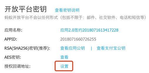 点击下图中的「设置」链接,在弹出的窗口中输入插件设置页面的授权回调地址,格式如下:http://你的域名/wc-api/wprs-wc-alipay-notify/